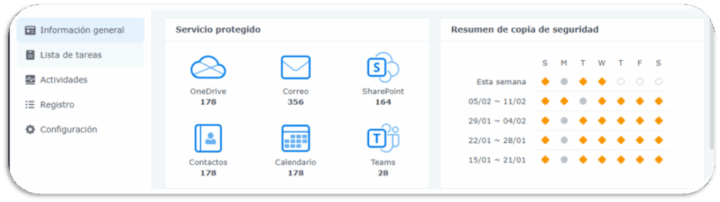Nuestros respaldos directos a G Suite y Office 365 son totalmente imperceptibles y no afectan el funcionamiento de estas plataformas. Se conectan directamente desde el administrador correspondiente y cuentan con un apartado especial en nuestro panel de control dedicado. Desde este panel, podrás visualizar la línea de tiempo de los respaldos realizados y recuperar archivos de forma rápida y sencilla en caso de necesidad. Con esta integración, garantizamos la seguridad de tus datos sin interferir con la productividad de tu equipo.